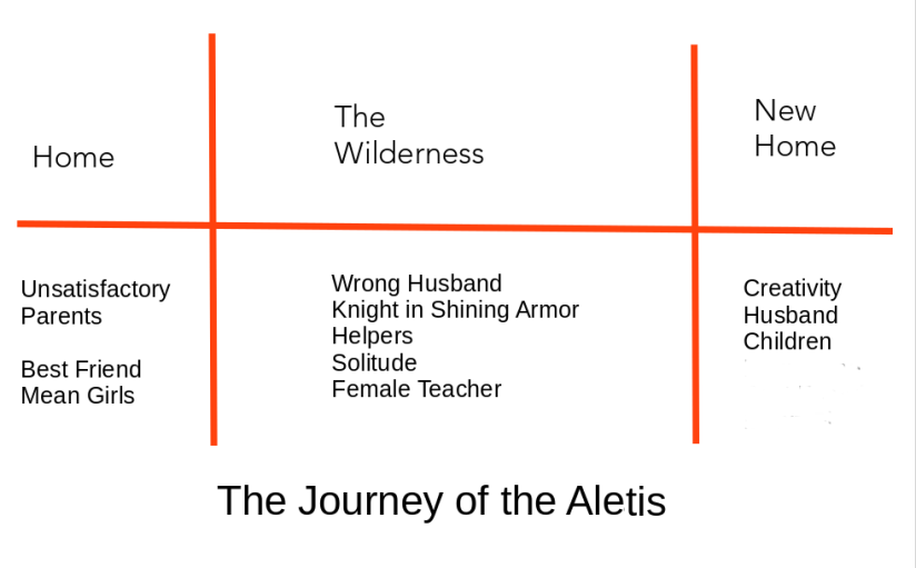 Leaving home and the temptations of other archetypes, the Aletis ventures out into a real or symbolic wilderness, sometimes in disguise. She may meet a female Teacher, sometimes one with sinister qualities, and perhaps an animal helper. Eventually, she returns to society, but on her own terms. She may find a new home, creativity, a true lover, and have children, having carved out a space where she can live on her own terms. She is less likely to transform society on a large scale, the way the Hero does, but that may also be part of what she has learned.